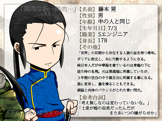 仙人の青龍・クーロンのもとで身体を鍛え、仲間たちとの再会時にはチャイナな装いになっていた。