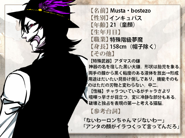 魔界ではかなり下の方に位置するインキュバス族の、特殊な階級を持つ夢魔。158cm。丸顔でデレツン。